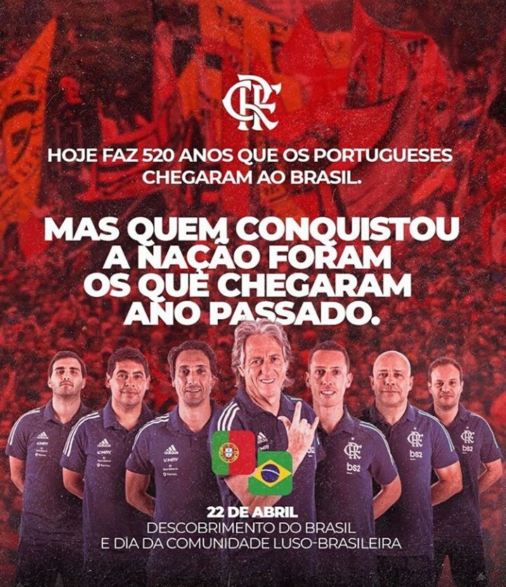 O Flamengo usou as redes sociais para homenagear os portugueses que fazem parte da comissão técnica do futebol profissional, aproveitando que 22 de abril é a data de celebração da comunidade luso-brasileira. Para agradecer, Jorge Jesus foi às redes sociais e publicou seu sentimento. O destaque ficou pelo amor mencionado pelo treinador rubro-negro.