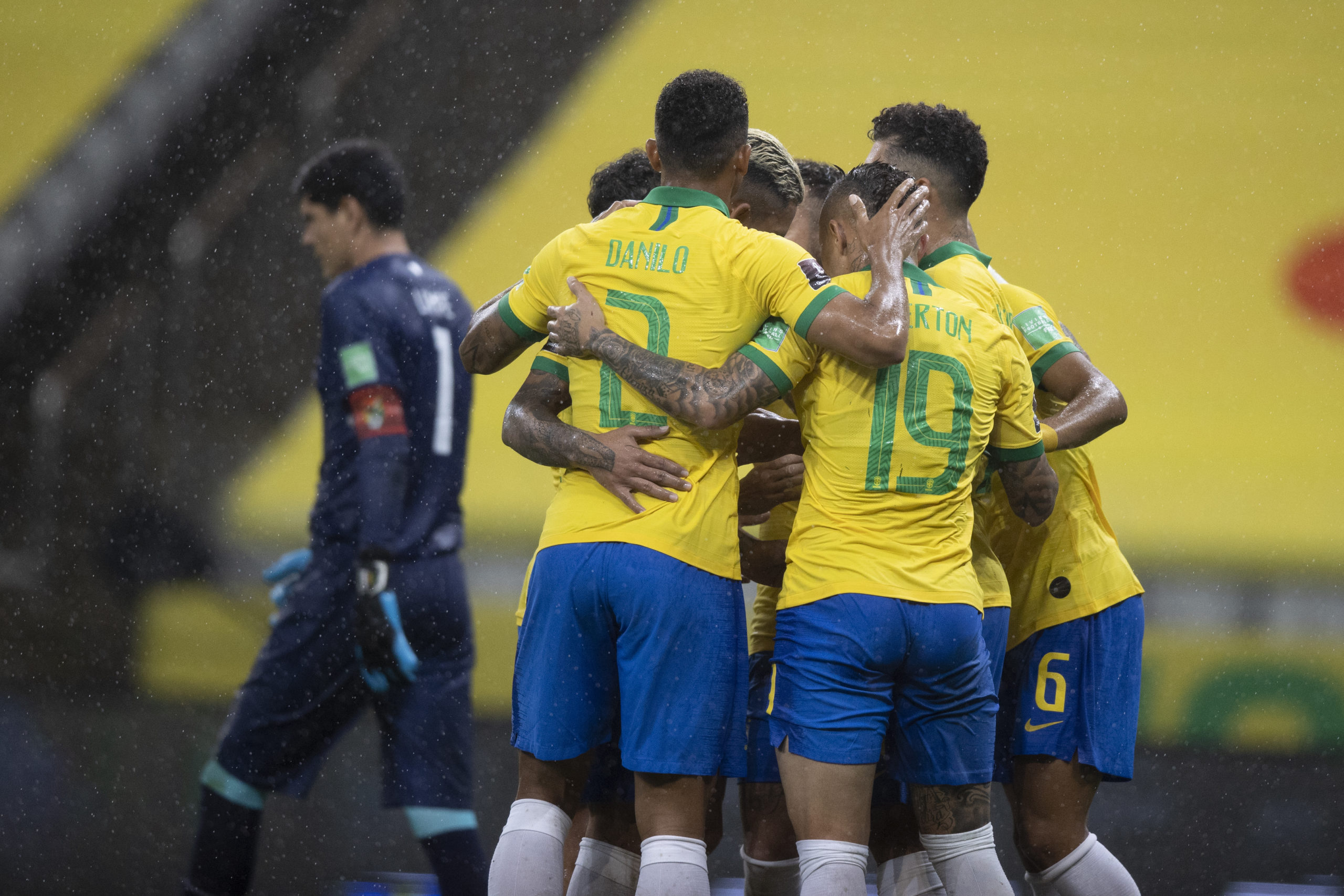 A Seleção Brasileira tomou iniciativa do jogo desde o primeiro minuto na Arena Corinthians e perdeu grandes oportunidades até abrir o placar. A primeira foi com Everton Cebolinha. O ex-atacante do Grêmio recebeu cruzamento de Renan Lodi, mas pegou mal na bola e perdeu um gol incrível. Logo depois, Marquinhos perdeu outra boa oportunidade. A Seleção Canarinho conseguiu chegar ao primeiro gol aos 15 minutos. O mesmo Marquinhos, que havia perdido um gol feito minutos antes, aproveitou o ótimo cruzamento de Danilo para abrir o marcador.