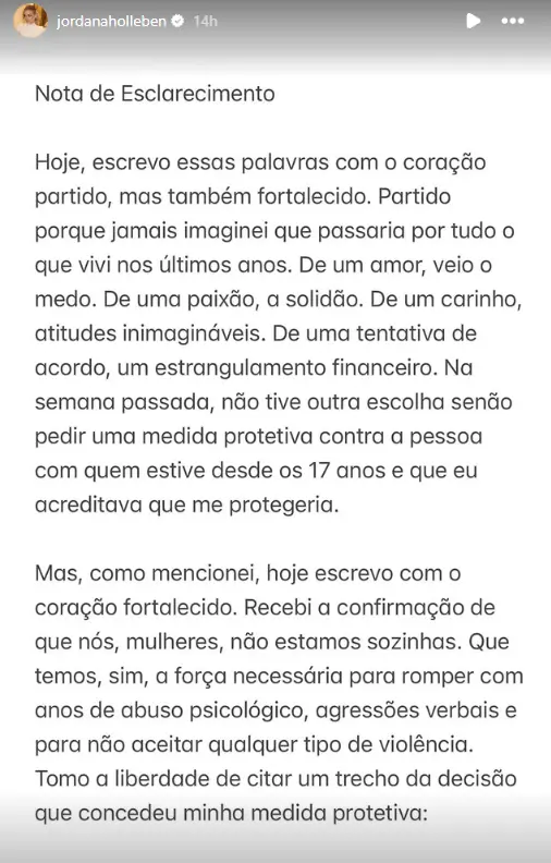 “Hoje, escrevo essas palavras com o coração partido, mas também fortalecido. Partido porque jamais imaginei que passaria por tudo o que vivi nos últimos anos. De um amor, veio o medo. De uma paixão, a solidão. De um carinho, atitudes inimagináveis. De uma tentativa de acordo, um estrangulamento financeiro. Na semana passada, não tive outra escolha senão pedir uma medida protetiva contra a pessoa com quem estive desde os 17 anos e que eu acreditava que me protegeria” iniciou a modelo, antes de terminar.