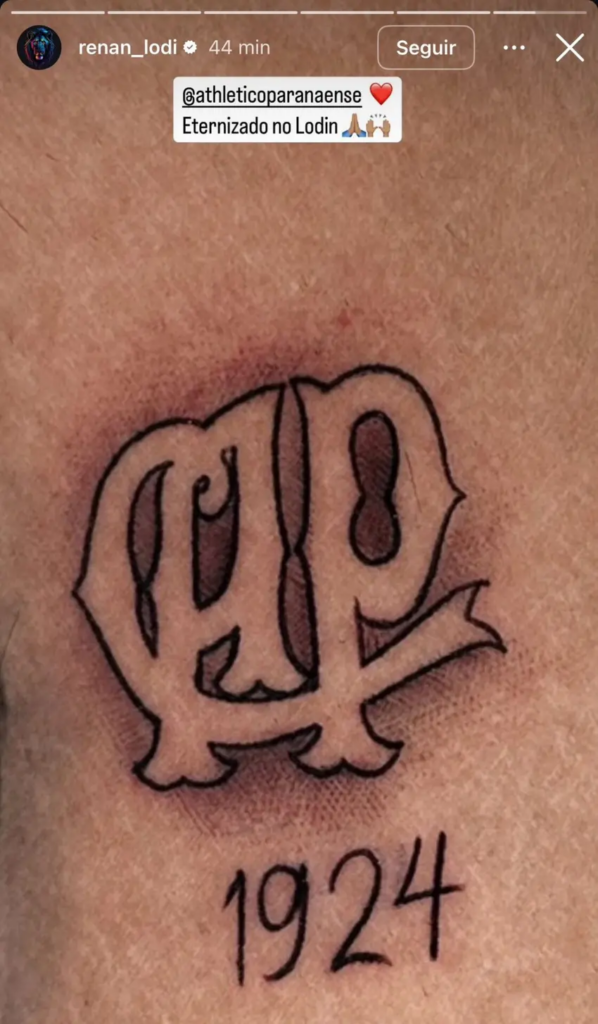 O curioso é que o jogador não utilizou a identidade visual atual do Furacão. Renan Lodi fez uma tatuagem com o símbolo antigo e o ano da fundação do Athletico.