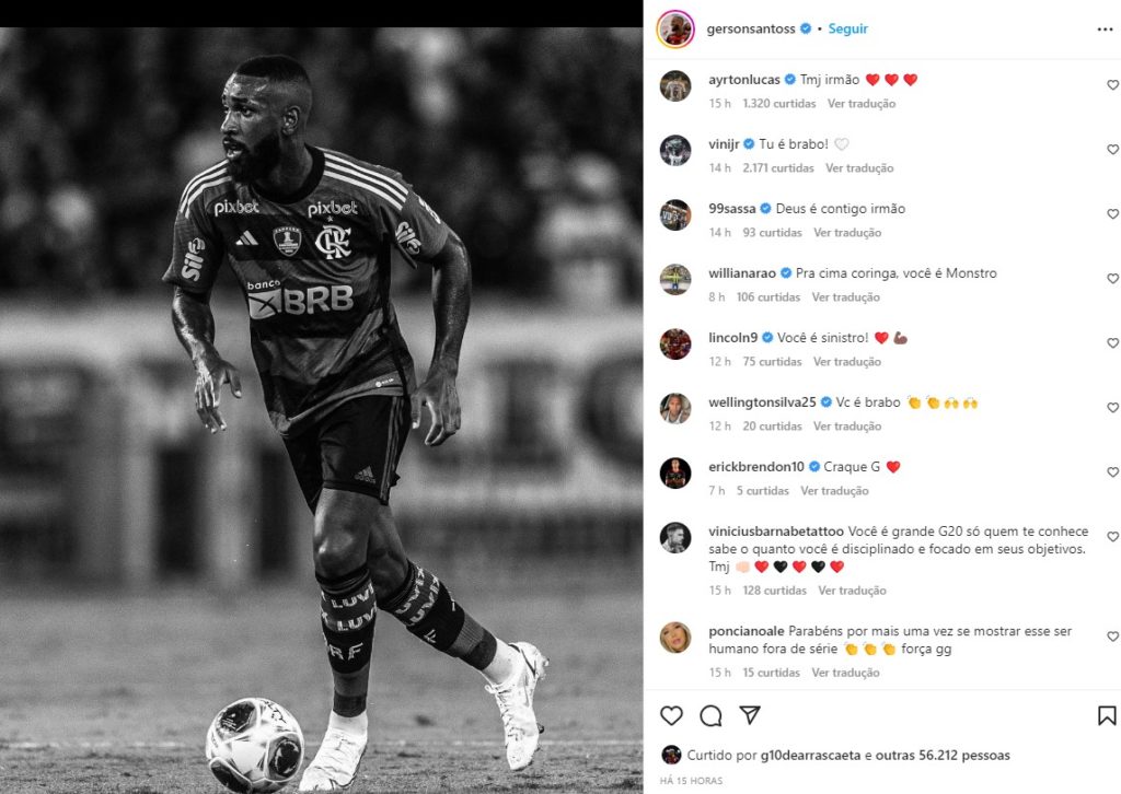“A dor, os erros e os dias ruins fazem parte da nossa vida. Ninguém está imune. Reconhecer aquilo que foi feito de errado, aprender, evoluir e seguir. As vezes situações são potencializadas por interferências externas, mas nós não controlamos o externo. Controlamos apenas nós mesmos e por isso olho só pra mim, em busca de evolução. O coração do atleta Gerson está magoado. Do torcedor Gerson, destroçado.” – disse. E prosseguiu.