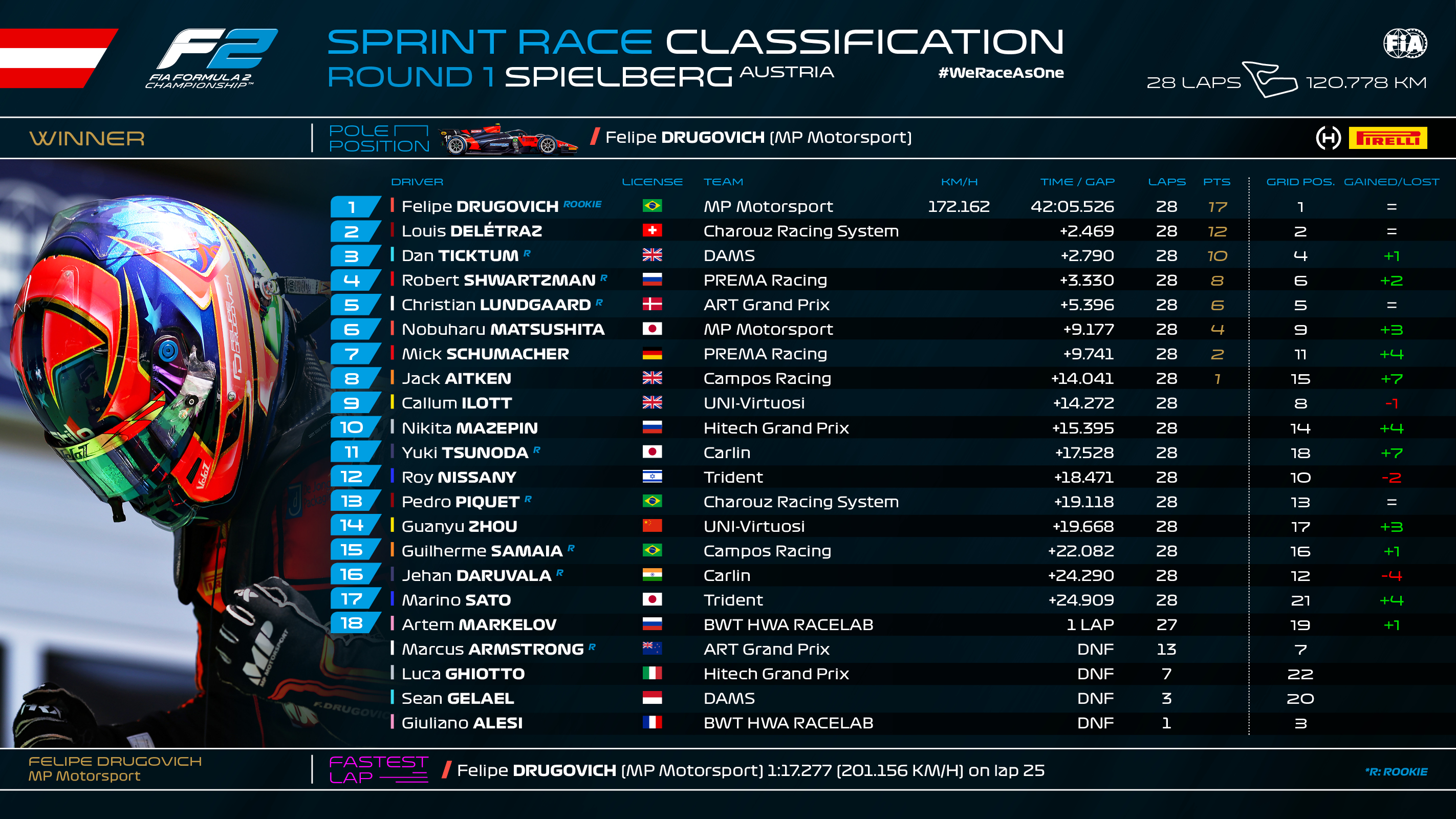 Além de Drugovich, mais dois brasileiros estão na Fórmula 2, mas não tiveram resultados tão satisfatórios. Pedro Piquet chegou na 13ª colocação, enquanto Guilherme Samaia foi o 15º. Todos voltam às pistas, novamente na Áustria, no próximo final de semana, para a disputa de mais duas provas. Confira o resultado da prova deste domingo: