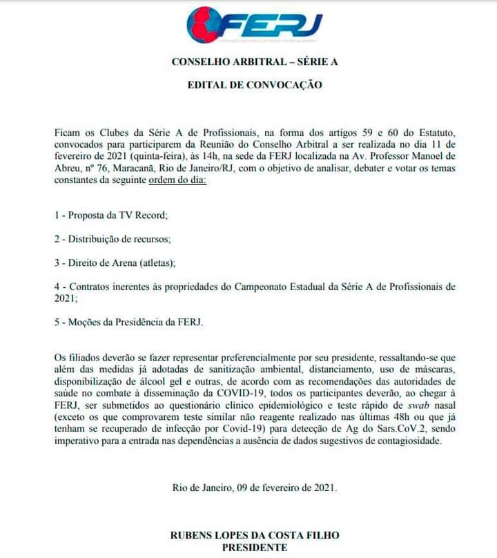 A Federação de Futebol do Estado do Rio de Janeiro (Ferj) convocou os clubes para um arbitral na próxima quinta-feira (11/02) para discutir assuntos relativos ao Campeonato Carioca 2021. Entre os assuntos da pauta, está uma proposta da TV Record para a transmissão do Campeonato Carioca 2021.