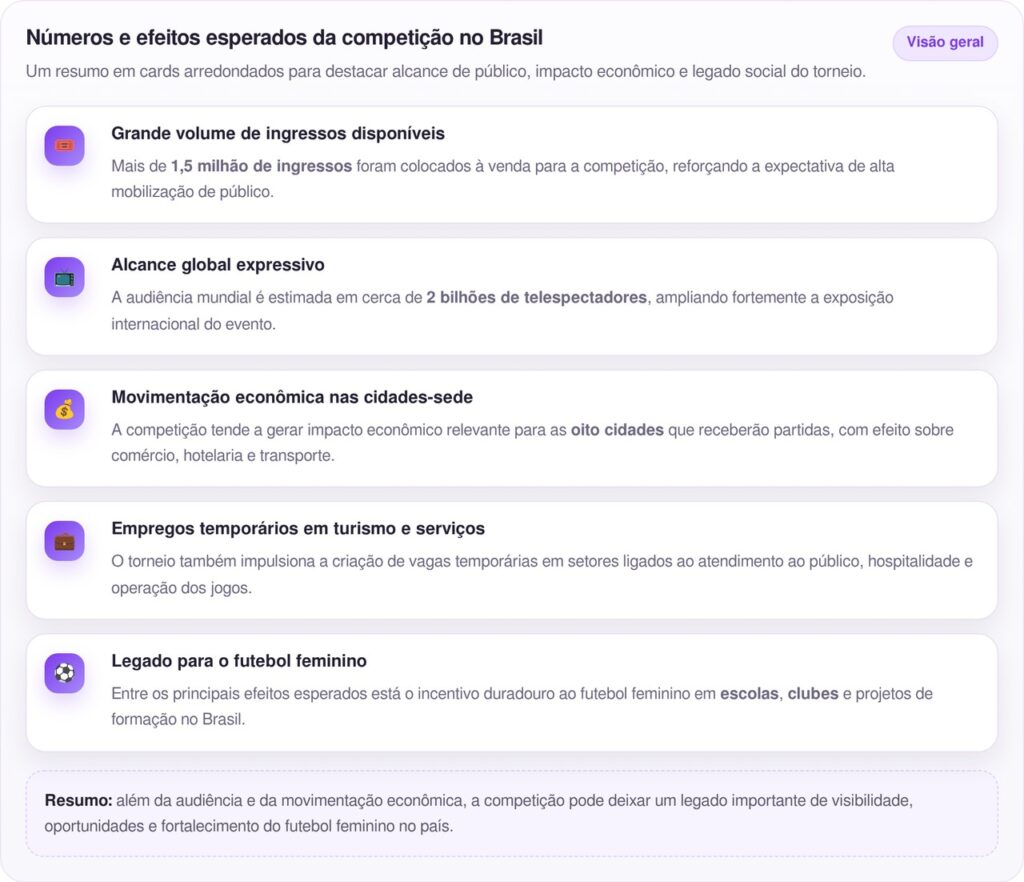 A entidade projeta recordes de bilheteria e audiência para o torneio. O futebol feminino vive expansão acelerada no mundo todo, com finais recentes batendo marcas históricas de público em estádios e telespectadores. A FIFA acredita que o Brasil pode repetir ou superar os números da edição anterior, especialmente nos jogos da seleção da casa.