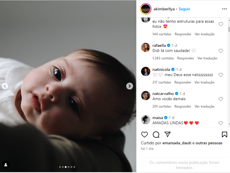 Na legenda do post, a modelo se declarou para a filha dizendo que a bebê era a mais linda do mundo. Nos comentários, uma internauta escreveu que parece com a mamãe, não tem nada do pai.