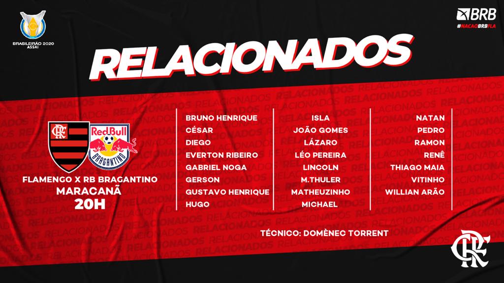 O departamento de futebol do Flamengo divulgou a lista de relacionados para a partida contra o Bragantino. O goleiro Diego Alves torceu o joelho esquerdo no treino de quarta-feira (14.10). Amanheceu nesta quinta-feira(15.10), com dor, um edema no ligamento colateral foi diagnosticado. Atleta iniciou tratamento integral. Após avaliações físicas e médicas realizadas na reapresentação, a comissão técnica decidiu poupar o atleta Rodrigo Caio do jogo desta noite, contra o Bragantino, as 20h, no Maracanã, pela 16ª rodada do Campeonato Brasileiro.