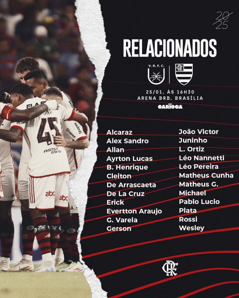O Flamengo anunciou, na tarde desta sexta-feira (24), os 24 atletas relacionados para o confronto de sábado contra o Volta Redonda, no Estádio Mané Garrincha, em Brasília, pelo Campeonato Carioca. A lista traz novidades importantes, como a presença do atacante Juninho, recém-contratado e apresentado como o novo camisa 23.
