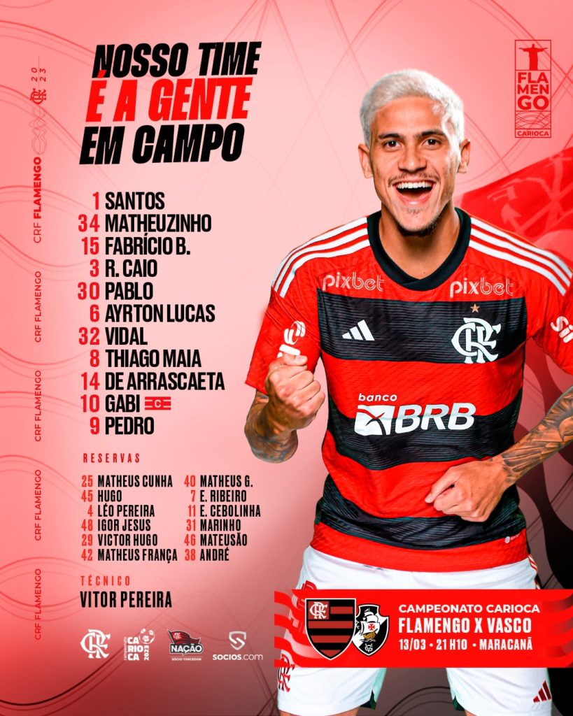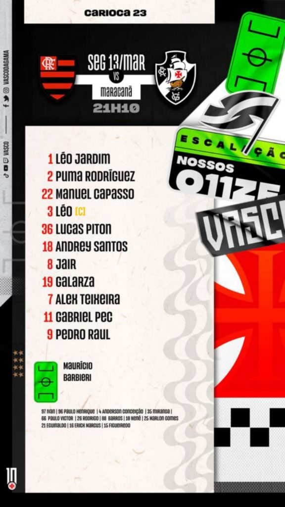 As equipes estão definidas para o clássico dos milhões! Flamengo e Vasco confirmaram as escalações para o jogo de ida da semifinal do Campeonato Carioca. O técnico Vítor Pereira vai iniciar a equipe com três zagueiros, enquanto a surpresa de Maurício Barbieri é a presença de Galarza entre os onze iniciais.