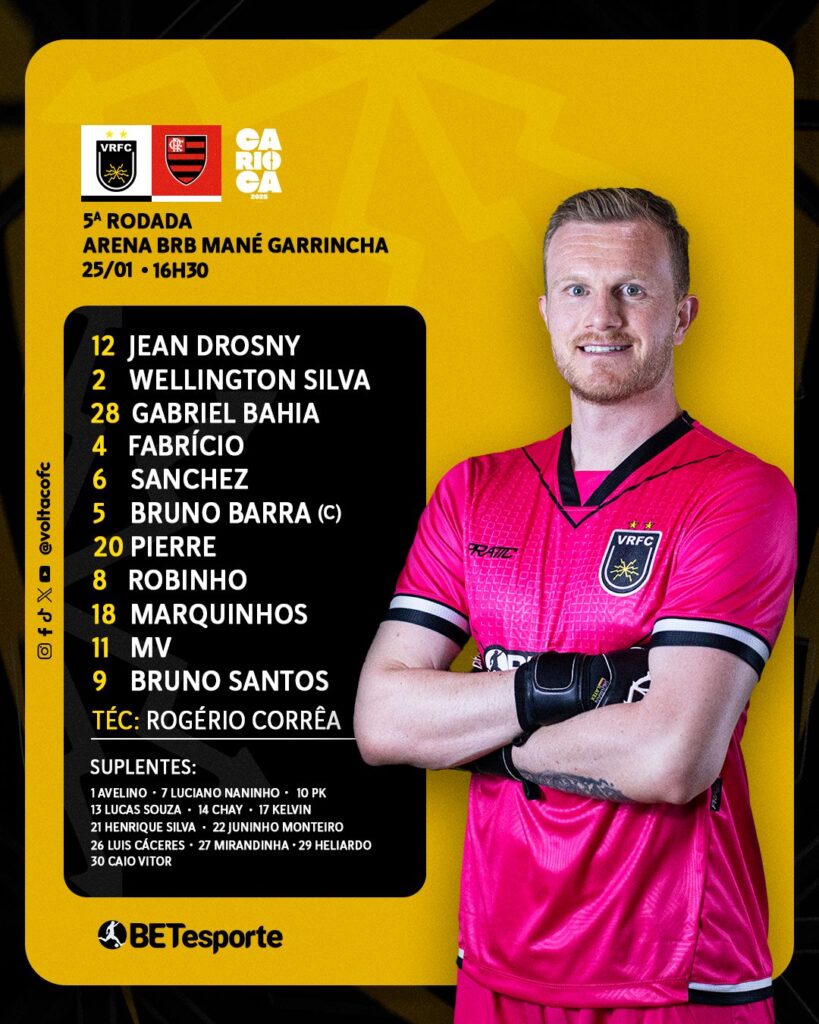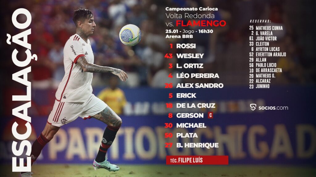 O Flamengo está escalado para o jogo deste sábado (25), contra o Volta Redonda, às 16h30, no Mané Garrincha, em Brasília. Assim como o técnico Filipe Luís, o grupo principal faz a sua estreia na temporada na 5ª rodada da Taça Guanabara. O Rubro-Negro terá força máxima em campo, à exceção de Arrascaeta, que fica no banco por não estar 100% fisicamente.