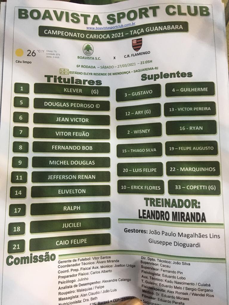 Já o Boavista, que está na parte de baixo da tabela, precisa ganhar para se distanciar da turma que luta para escapar do rebaixamento. A equipe do técnico Leandro Miranda está assim escalada para enfrentar o Rubro-Negro: Kléver, Caio Felipe, Douglas Pedroso, Elivelton e Jean; Fernando Bob, Jucilei e Ralph; Jefferson Renan, Michel Douglas e Vitor Feijão.