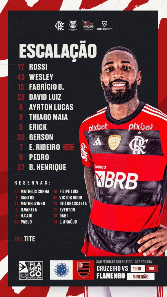 Flamengo está escalado para enfrentar o Cruzeiro pelo Brasileirão; confira