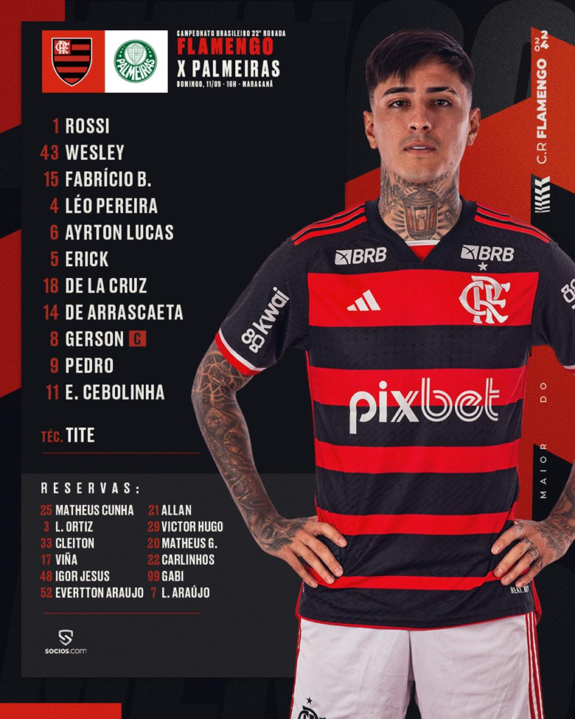 Tite definiu o Flamengo que vai começar o duelo contra o Palmeiras, pela 22ª rodada do Campeonato Brasileiro. Com força máxima, o Rubro-negro vai em busca da vitória para retomar a liderança após a derrota do Botafogo para o Juventude.