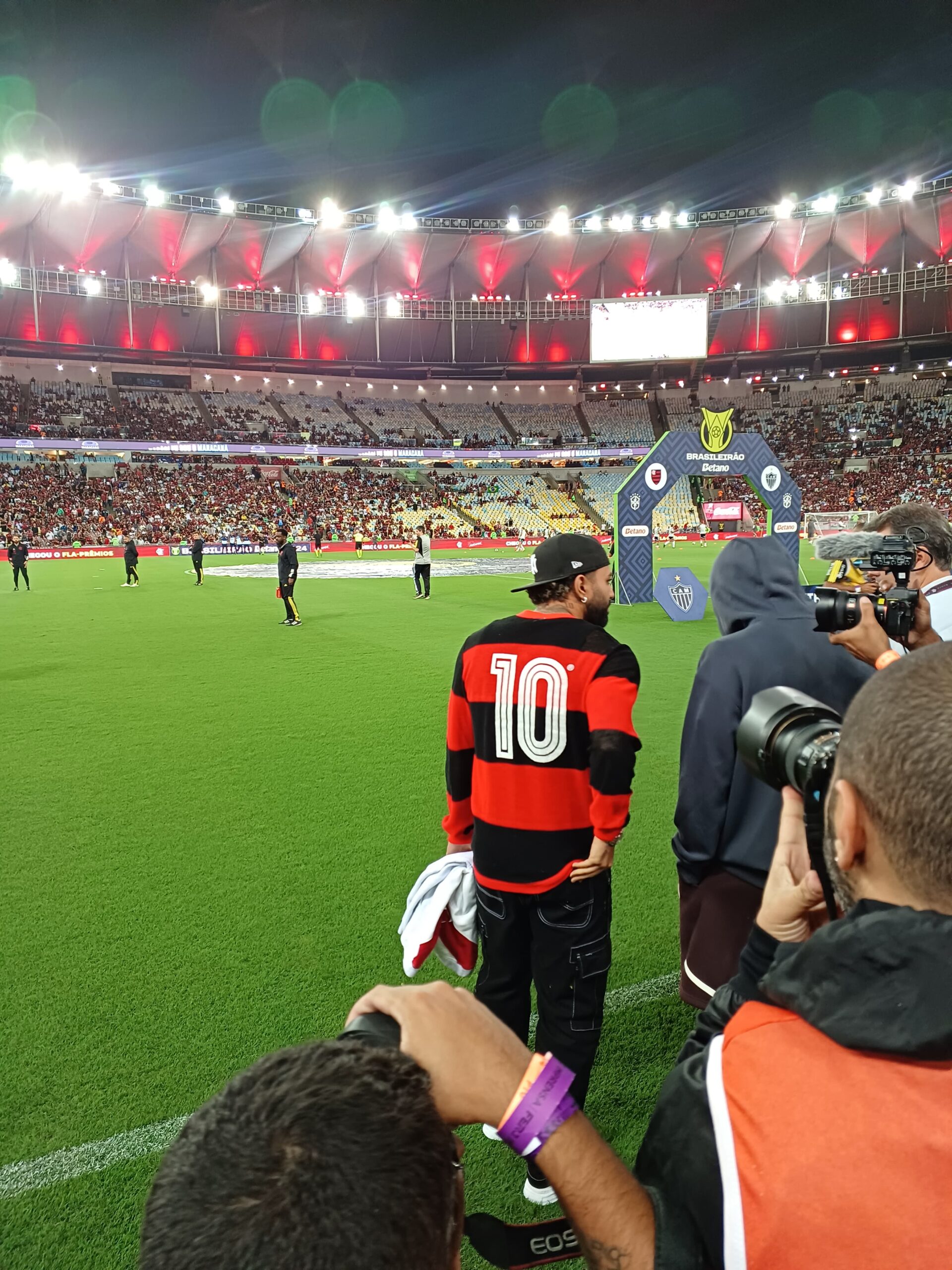Nesta quarta-feira (13), Gabigol acompanhou o aquecimento do Flamengo no gramado do Maracanã para a partida contra o Atlético-MG, pela 33ª rodada do Campeonato Brasileiro. O atacante estava vestindo uma camisa retrô do Rubro-negro com o número 10 na parte de trás.