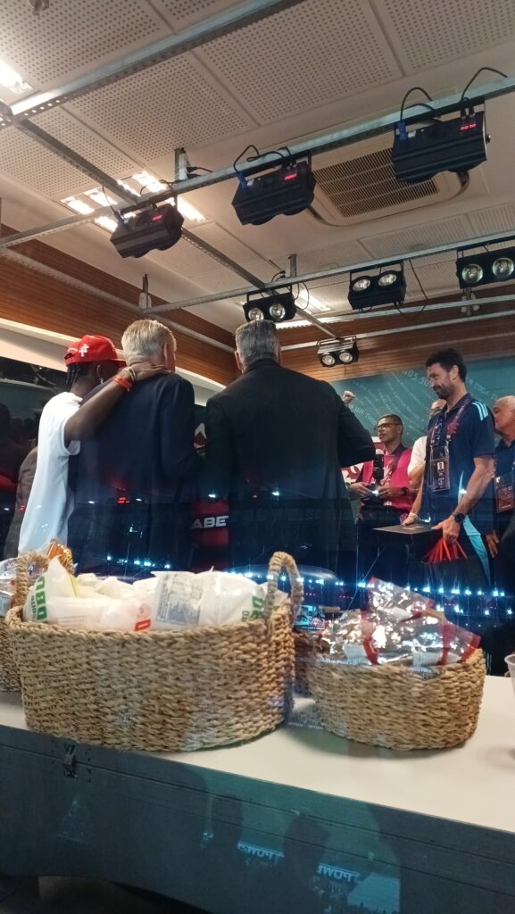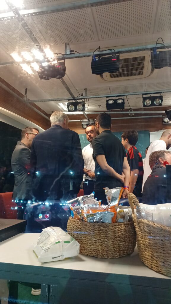 A diretoria do Flamengo presenteou o treinador italiano com uma camisa do clube. Além dos mandatários da equipe, Vinicius Junior, cria das categorias de base do Rubro-negro também está no camarote. O uniforme foi entregue pelo diretor técnico José Boto.