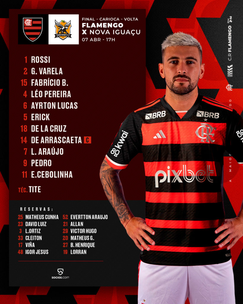 O Flamengo enfrenta o Nova Iguaçu neste domingo (07), às 17h (de Brasília), no Maracanã, pelo segundo jogo da final do Campeonato Carioca. O primeiro duelo terminou com vitória Rubro-Negra por 3 a 0. A partida terá transmissão da Super Rádio Tupi com narração do José Carlos Araújo e comentários do Apolinho.