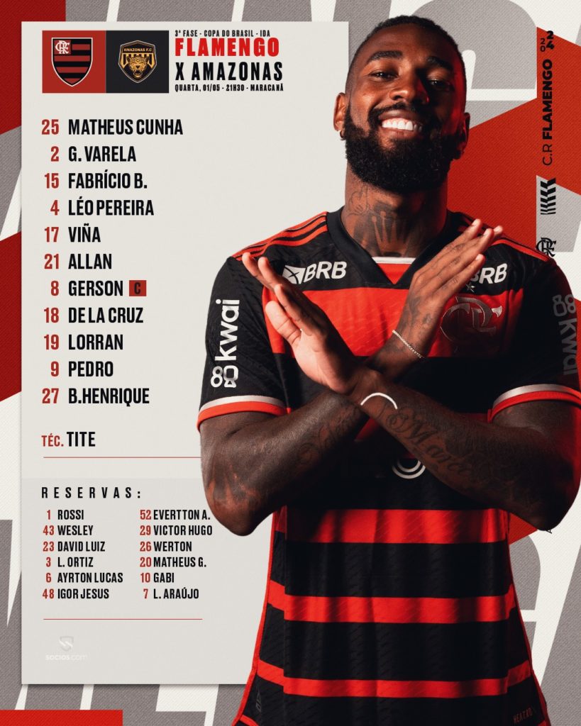 O Flamengo encara o Amazonas, nesta quarta-feira (01), às 21h30 (de Brasília), no Maracanã, pelo jogo de ida da terceira fase da Copa do Brasil. O atacante Gabigol conseguiu efeito suspensivo e está à disposição do técnico Tite no banco de reservas.