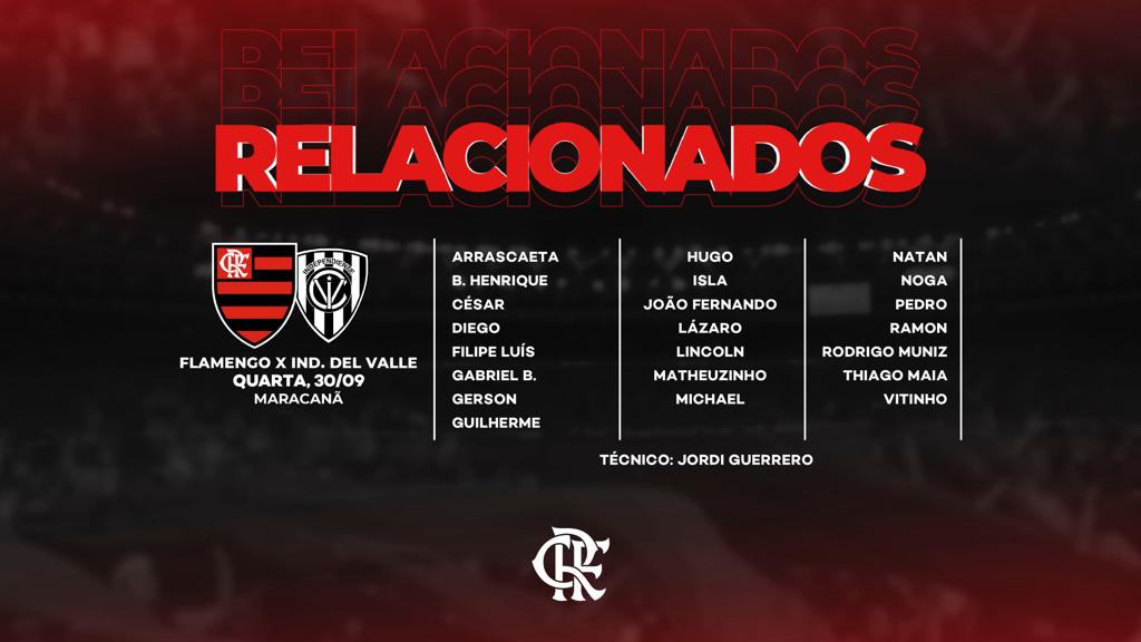O Flamengo divulgou, na noite desta terça-feira (29/09), a lista de relacionados para a partida contra o Independiente del Valle, pela 5ª rodada da fase de grupos da Libertadores. Dentre os jogadores que vão para o jogo, estão os sete que testaram positivo para o coronavírus no Equador e desfalcaram o time contra o Barcelona de Guayaquil. O clube recebeu o aval da Conmebol, pois os atletas já cumpriram o período de dez dias da quarentena e estão assintomáticos.