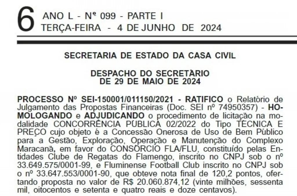 O Governo do Estado do Rio de Janeiro publicou, nesta terça-feira (04), a homologação da vitória de Flamengo e Fluminense na licitação do Maracanã. Dessa forma, os dois clubes são responsáveis pela manutenção do Complexo Maracanã pelos próximos 20 anos.