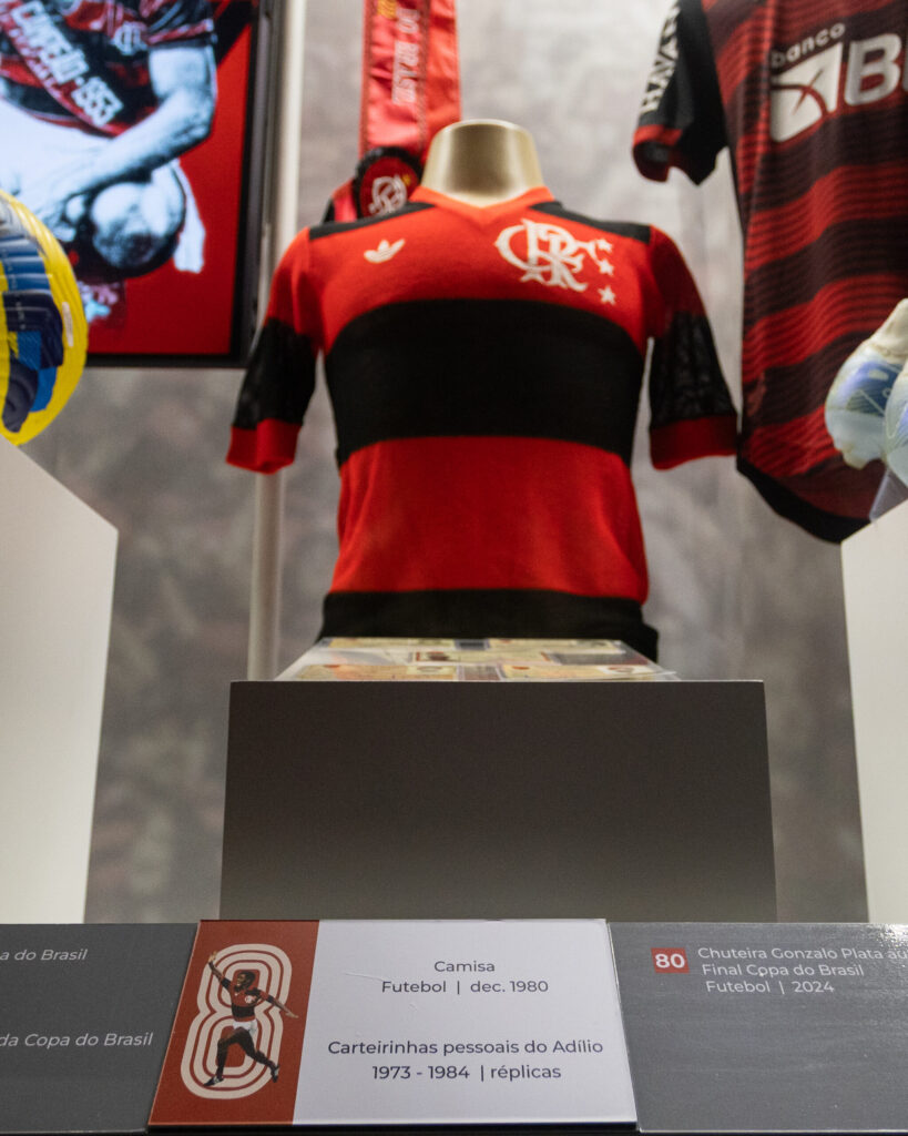 O espaço dedicado ao ex-jogador traz uma série de itens simbólicos, como o manto utilizado na final do Mundial de Clubes de 1981, troféus, faixas dos principais títulos conquistados, além de fotografias de sua infância na Cruzada São Sebastião. A exposição revela também aspectos pessoais de Adílio, com instrumentos musicais e objetos que mostram o talento e a sensibilidade por trás do craque.