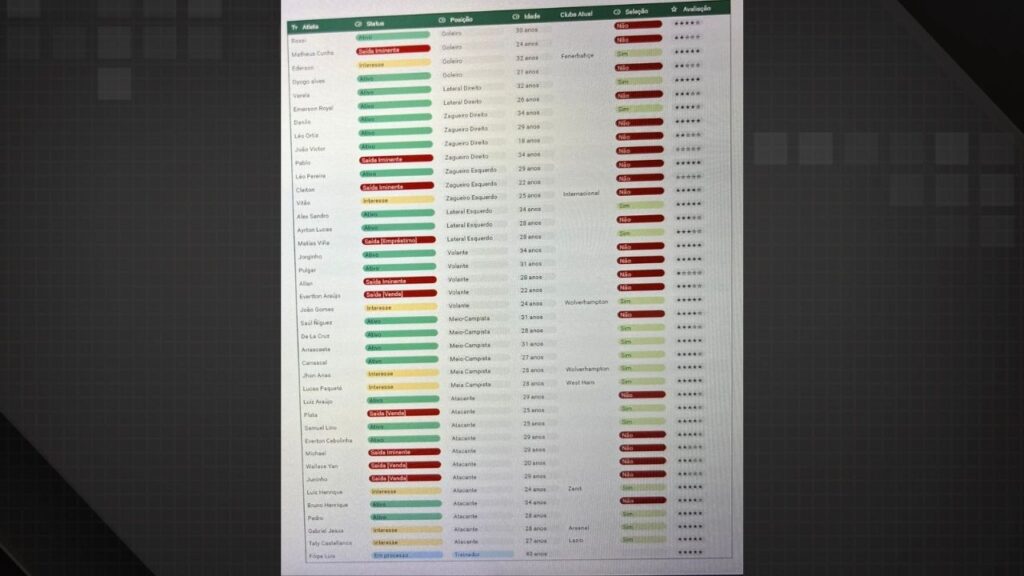O vazamento também traz indícios de movimentações internas. O documento aponta que alguns atletas do atual elenco podem ser negociados na próxima janela de transferências. Entre os nomes citados como possíveis saídas estão Evertton Araújo, Plata e Wallace Yan, jogadores que podem abrir espaço na folha salarial e gerar receita para novos investimentos.
