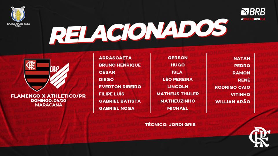 O Flamengo divulgou a lista de relacionados para a partida contra o Athletico, pela 13ª rodada do Campeonato Brasileiro. A partida vai ser realizada neste domingo (04/10), às 16h, no Maracanã. O rubro-negro carioca conta com a volta de jogadores que testaram positivo para o coronavírus, como Everton Ribeiro, Rodrigo Caio e Willian Arão. Entretanto, o time não conta com o zagueiro Gustavo Henrique, o meia Thiago Maia – poupado – e Gabigol, lesionado.