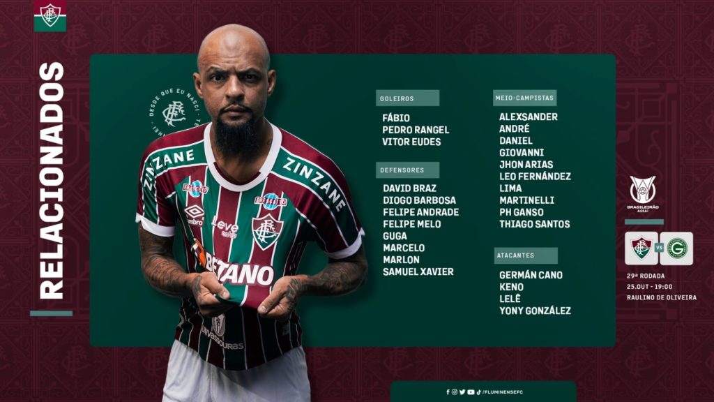 O Fluminense divulgou a lista de relacionados para a partida desta quarta-feira (25), contra o Goiás, às 19h, no Estádio Raulino de Oliveira. Marcelo, Felipe Melo, Lima e Thiago Santos, suspensos na última rodada, voltam ao time. John Kenney segue fora, assim como Nino, que se recupera de lesão.