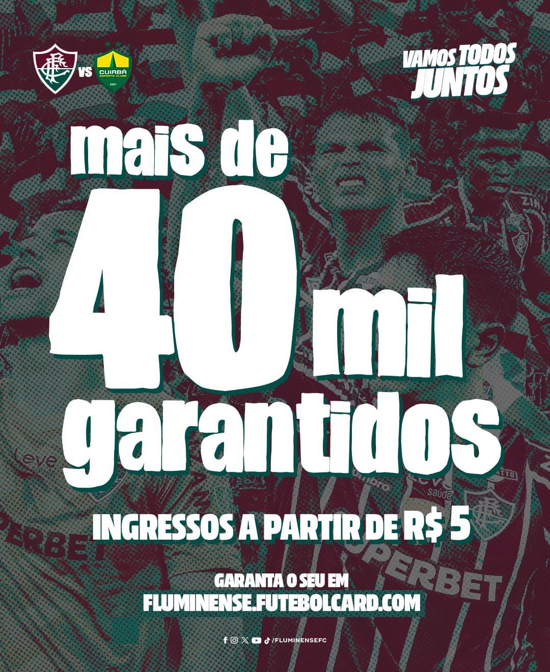 O Fluminense terá casa cheia no jogo de quinta-feira decisivo contra o Cuiabá, no Maracanã. O clube informa que mais de 40 mil ingressos já foram adquiridos e está aumentando a demanda na carga de ingressos.