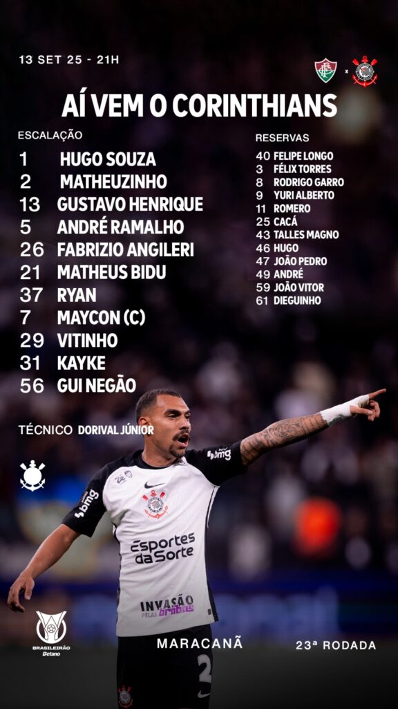 Por outro lado, o Corinthians encara o duelo como decisivo para ganhar fôlego na competição. O Timão sabe da dificuldade de enfrentar o Fluminense fora de casa, mas confia em sua organização defensiva e na experiência de peças importantes para tentar surpreender no Rio de Janeiro.