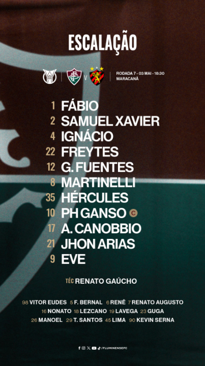 O técnico Renato Gaúcho escalou um time próximo do 100% para enfrentar o Sport, no Maracanã. Com os desfalques de Thiago Silva e Cano, o treinador colocou Ignácio e Eve nos respectivos lugares no time titular.