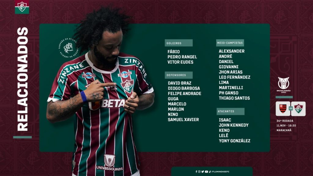 Com isso, a provável escalação do Tricolor tem: Fábio; Samuel Xavier, Nino, Marlon (David Braz) e Marcelo; André, Martinelli e Ganso; Arias, Keno e John Kennedy.