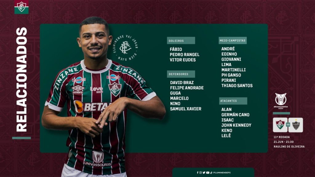 O Fluminense divulgou a lista de relacionados para partida contra o Atlético Mineiro, nesta quarta-feira (21), às 21h30 (de Brasília), no Raulino de Oliveira, pela 11ª rodada do Campeonato Brasileiro. O volante André, que estava servindo a seleção brasileira, foi relacionado para o jogo. Ele entrou em campo aos 28 minutos do segundo tempo na derrota por 4 a 2 contra Senegal. A joia tricolor ficou em campo por 24 minutos. André desembarcou no Rio na manhã desta quarta.