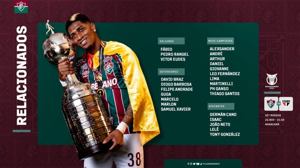 O Fluminense divulgou a lista de relacionados para o jogo contra o São Paulo. As equipes se enfrentam nesta quarta-feira (22), às 21h30, no Maracanã, em jogo atrasado da 32ª rodada do Campeonato Brasileiro.