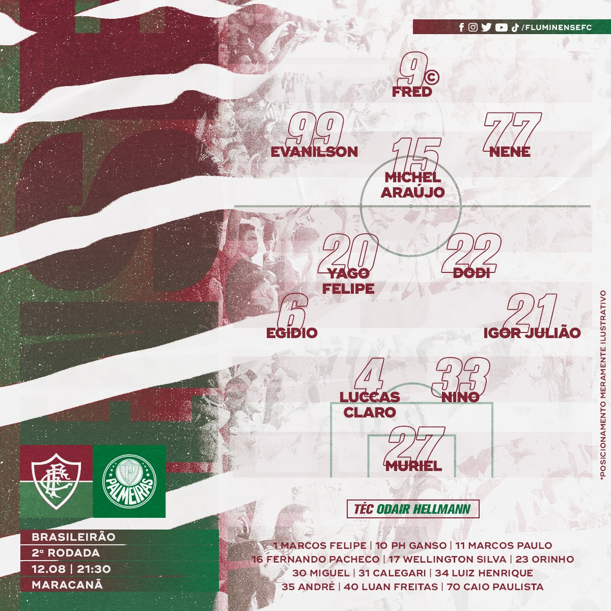 Para o centroavante entrar no time principal, Odair Hellmann optou por barrar Marcos Paulo. Com isso, o trio de ataque vai ser formado com Fred centralizado, Evanilson e Nenê abertos. No meio de campo, Michel Araújo ganhou a vaga na equipe inicial.