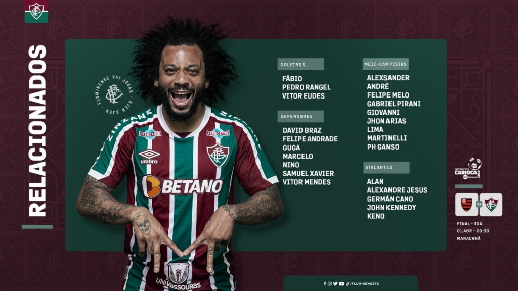 O Fluminense divulgou a lista dos relacionados para a partida contra o Flamengo neste sábado (01), às 20h30 (de Brasília, pelo primeiro jogo da final do Campeonato Carioca. O lateral Marcelo está na lista e pode fazer sua estreia com a camisa do Tricolor Carioca.