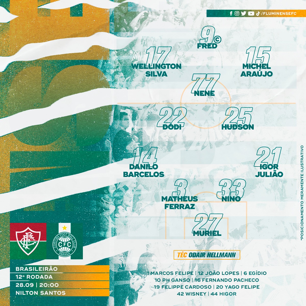O Fluminense encara o Coritiba nesta segunda-feira, às 20h, no Estádio Nilton Santos, com novidades: Danilo Barcelos entra no lugar de Egídio que não defendeu a equipe tricolor nos jogos contra o Atlético-GO porque já havia jogado na Copa do Brasil pelo Botafogo. Outra novidade, é que Matheus Ferraz, Igor Julião e Fred voltam ocupar a vaga de titulares, nos lugares de Luccas Claro, Calegari e Luiz Henrique, respectivamente, todos com Covid-19.