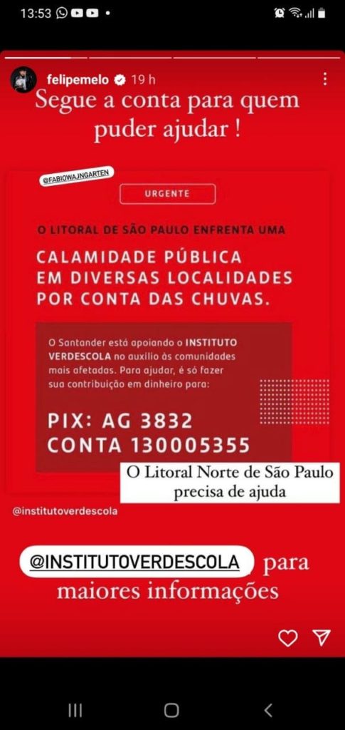 O volante Felipe Melo entrou também na corrente de solidariedade para ajudar as vitimas da tragédia do litoral norte de São Paulo. Ele colocou a disposição um número de conta para oferecimento de donativos de pix.
