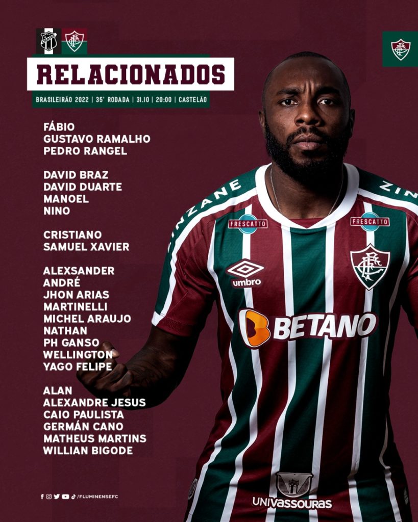 O Fluminense divulgou a lista de relacionados para a partida contra o Ceará, nesta segunda, às 20h, no Castelão. O lateral Calegari, lesionado, e o volante Felipe Melo, suspenso, estão fora. O duelo é importante na briga da equipe por uma vaga na fase de grupos na Libertadores.