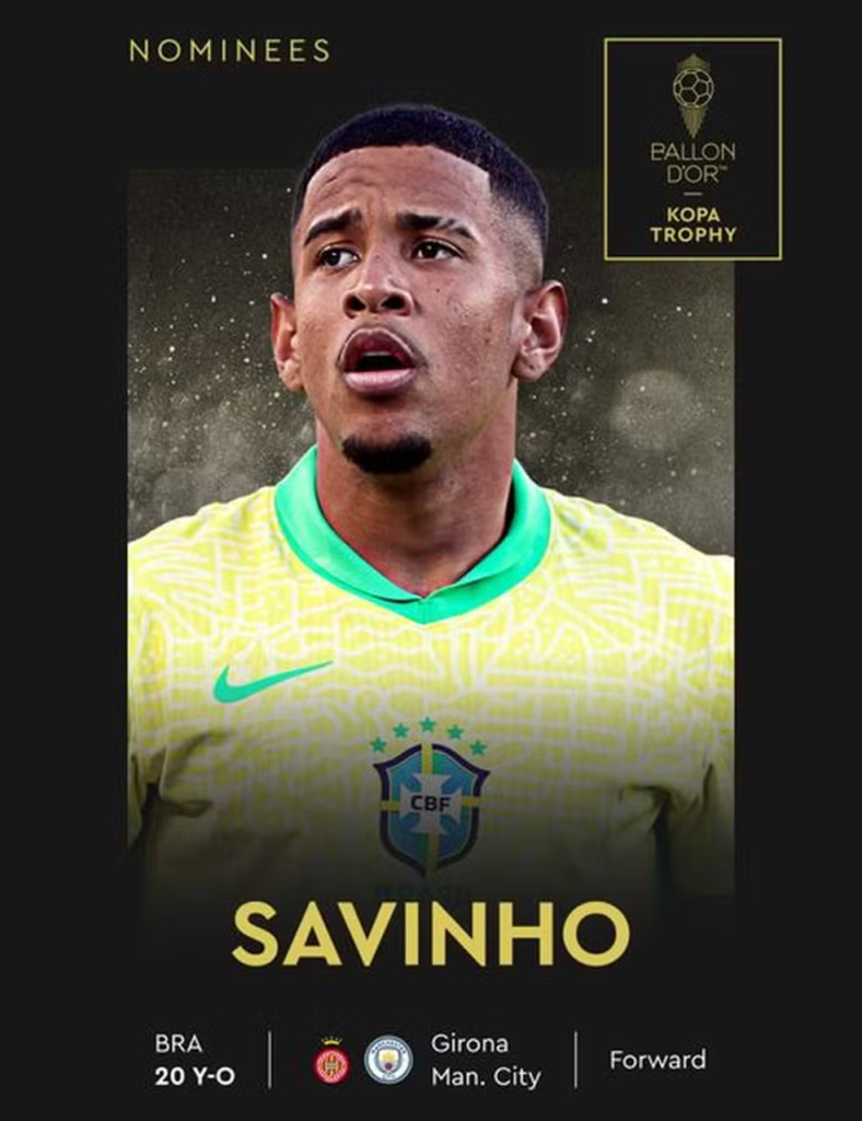 Na premiação para os melhores jogadores sub-21 da temporada, o brasileiro Savinho, ex-Girona, e hoje do Manchester City, está no páreo. Ele concorrerá com com nomes como Lamine Yamal, do Barcelona, e Arda Güler, do Real Madrid. Garnacho e Mainoo, do Manchester United, Cubarsí, também do Barcelona, Konaté, do RB Salzburg, Zäire-Emery, do PSG, Mathys Tel, do Bayern de Munique, e João Neves, ex-Benfica, e hoje do PSG, são outros concorrentes.