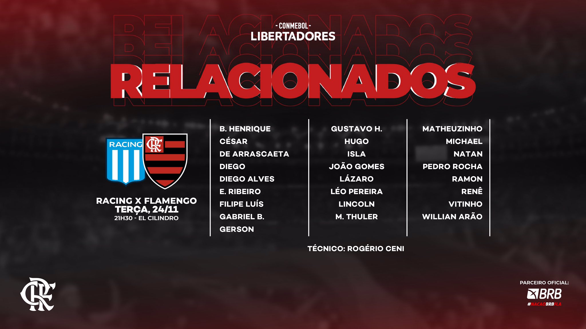 Confira a lista de relacionados do Flamengo para o jogo com o Racing: