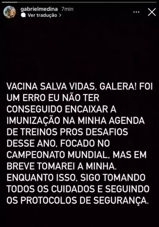 “Vacina salva vidas, galera! Foi um erro eu não ter conseguido encaixar a imunização em minha agenda de treinos para os desafios desse ano, focado no campeonato mundial, mas em breve tomarei a minha. Enquanto isso, sigo tomando todos os cuidados e protocolos de segurança”, escreveu ele no story do Instagram.