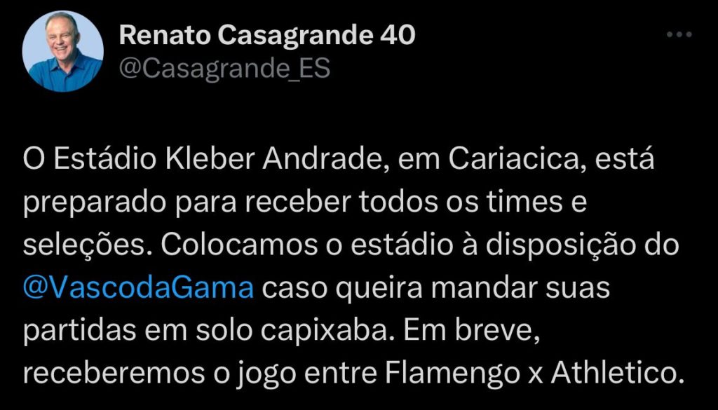 O governador fez uma publicação nas suas redes sociais convidando o Vasco a jogar no Kleber Andrade. Casagrande também abriu as portas para outros clubes que queiram atuar no estádio.