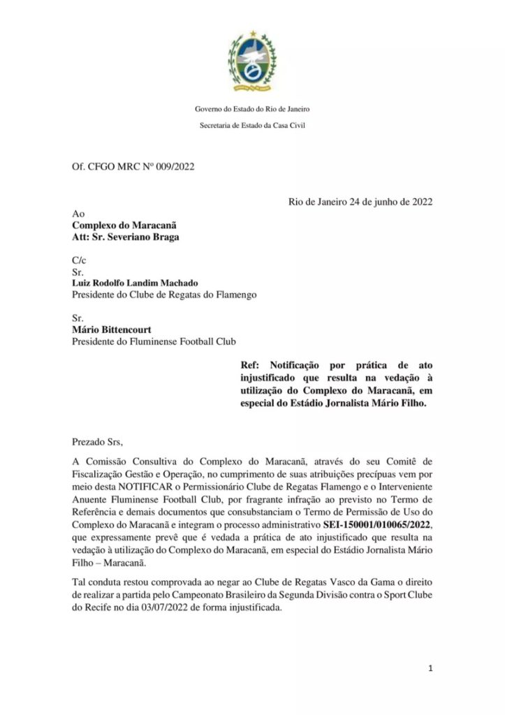 Governo do RJ notifica dupla Fla-Flu e exige que jogo entre Vasco e Sport seja realizado no Maracanã