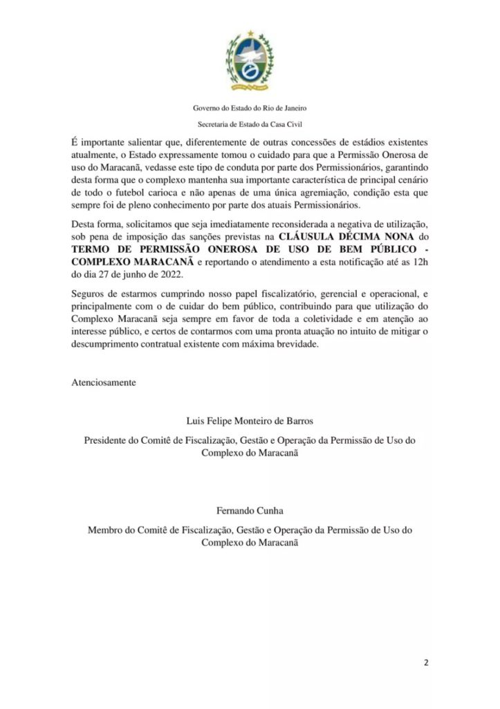 De acordo com o documento da Casa Civil, as equipes poderão sofrer sanções caso não liberem a realização da partida do dia 03 de julho no estádio, como está previsto na cláusula 19ª do Termo de Permissão Onerosa de Bem Público do Complexo do Maracanã. Ou seja, Flamengo e Fluminense podem ser multados ou até mesmo, em última instância, perder o termo de permissão do estádio.