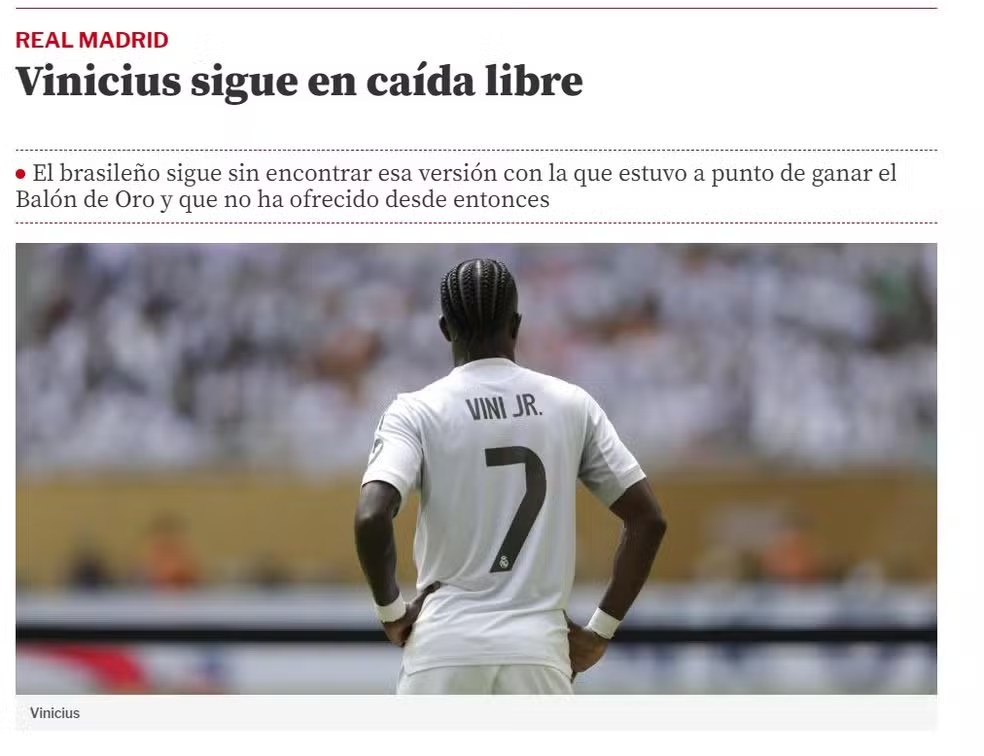 “Se o diagnóstico geral para o Real Madrid após a estreia fracassada na Copa do Mundo de Clubes contra o Al-Hilal não é bom, um dos sintomas mais claros é a forma de Vinícius . O craque brasileiro, abatido desde aquela famosa tarde em que soube que não ganharia a Bola de Ouro, continua em queda e oferece um nível a cada partida muito distante do que já foi visto dele no passado” – traz a reportagem de Mário Calderón.