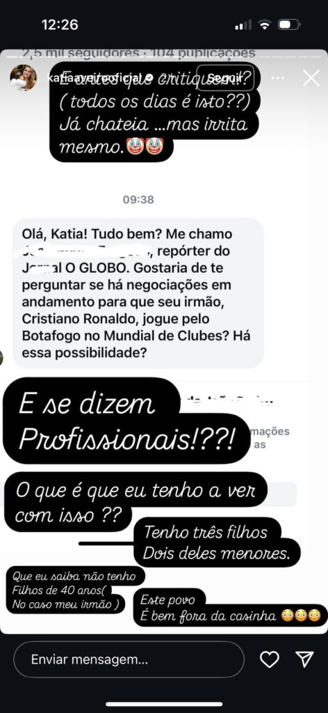 A irmã do craque Cristiano Ronaldo não gostou nada ao receber pergunta no direct do Instagram sobre a possibilidade do português jogar no Botafogo.