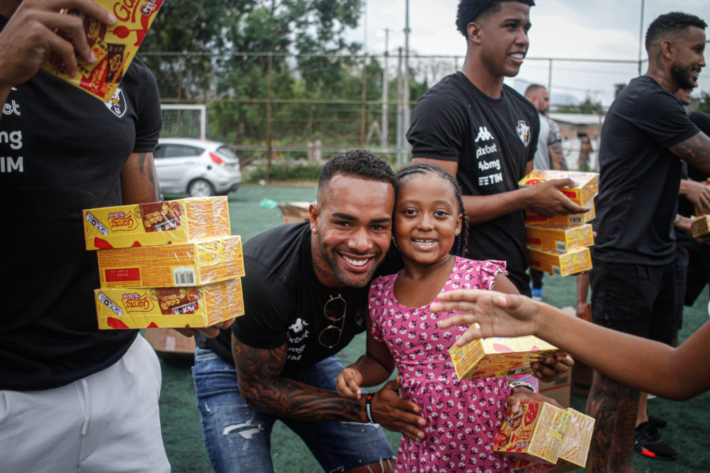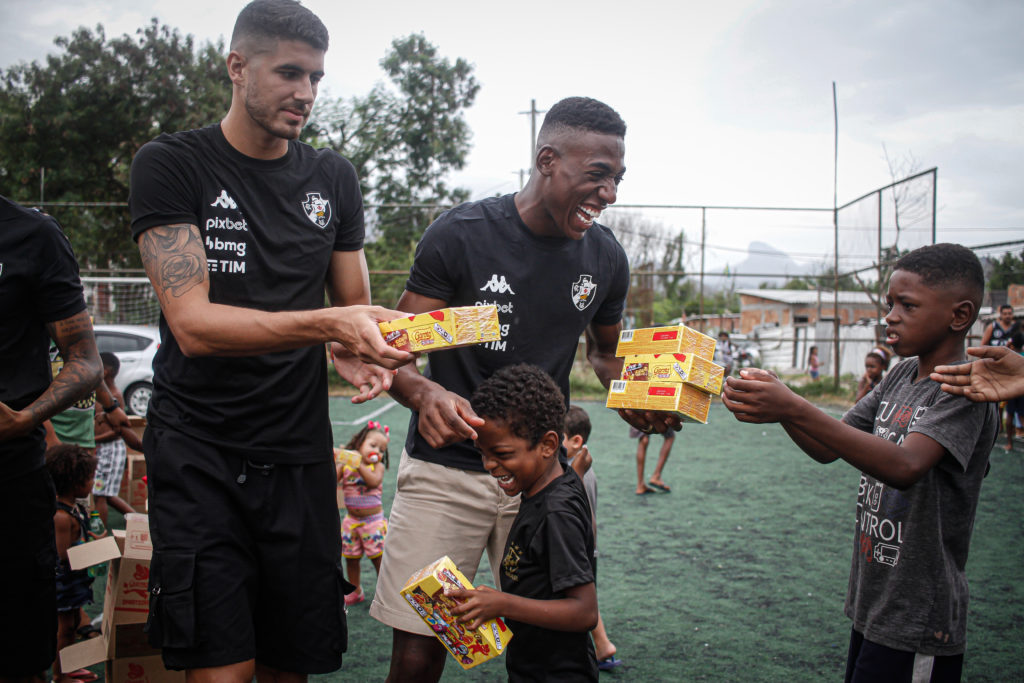 Jogadores do Vasco distribuem chocolates para as crianças na Cidade de Deus