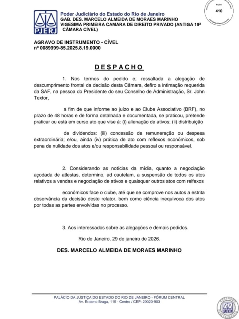 O despacho foi assinado pelo desembargador Marcelo Almeida de Moraes Marinho, da 21ª Câmara de Direito Privado do TJ-RJ, e impede qualquer tipo de alienação de ativos, além de mudanças relevantes na estrutura da SAF alvinegra.