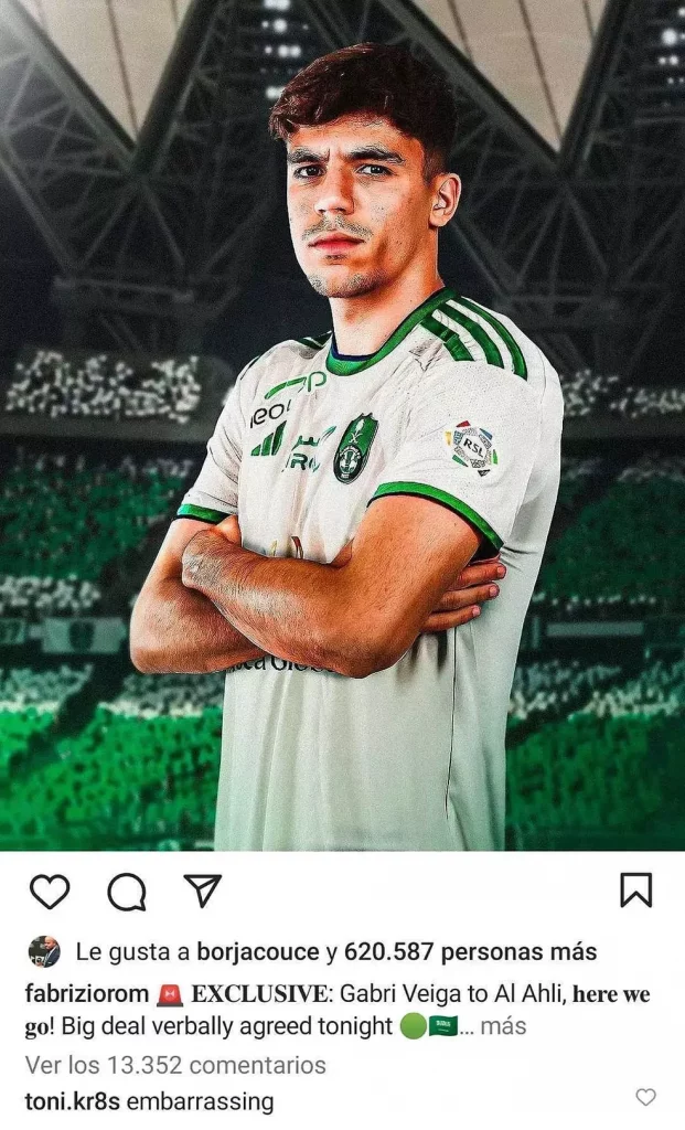 “Vergonhoso”, comentou Kroos na publicação do jornalista Fabrizio Romano, que confirmava a transferência de Veiga ao Al Ahli.