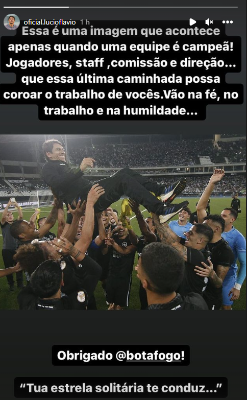 O técnico Lúcio Flávio divulgou uma mensagem de despedida do Botafogo. Em publicação nas redes sociais, na tarde desta terça-feira (14), o profissional que estava no cargo de maneira interina desejou sucesso ao elenco na reta final do Campeonato Brasileiro. Na sequência, o clube anunciou oficialmente a demissão do ex-jogador.