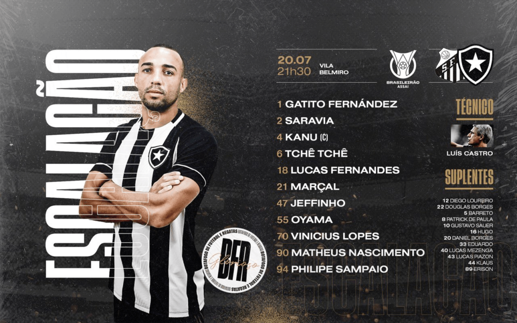 Luís Castro mexe no time e Botafogo está escalado com novidade para encarar o Santos pelo Campeonato Brasileiro - Super Rádio Tupi